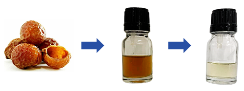 Soapberry has been used as a detergent since a long time ago, and saponins in soapberry act as a natural surfactant. However, the extract is usually yellow-brown or dark-brown. This limited its application in some cleaning products. Hydrogen peroxide was used as a decolorization agent to improve the color of the extract. In this study, the seedless soapberry was dried and crushed. The mixture of ethanol and water (1:1) was then added. The ratio of raw material to solvent was 1:10 (g/mL). The mixture was stirred at room temperature for 6 hours. The orthogonal matrix L9 (34) consisted of nine experiments to optimize the influence of factors such as hydrogen peroxide concentration, temperature, time, and pH. The results showed a decolorization rate of 91.73% and total saponin loss of 6.47% at a hydrogen peroxide concentration of 6%, a temperature of 80 oC, a time of 80 mins, and pH of 8.