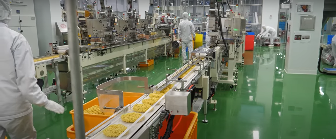 Sau đó, xe đưa nhóm mình vào tham quan dây chuyền sản xuất. Nhà máy cực kỳ hiện đại và sạch lắm luôn các bạn ơi. Một dây chuyền gồm 12 công đoạn, mỗi phút sản xuất được 4.000 gói mì lận đó, Tất cả gần như tự động hoàn toàn và được kiểm tra chặt chẻ đến từng dòng chữ in trên bao bì, từng dị vật bé xíu lạc gói mì vào cũng được đưa về phòng R&D để các anh chị kỹ sư phân tích nguyên nhân để khắc phục, cải tiến.