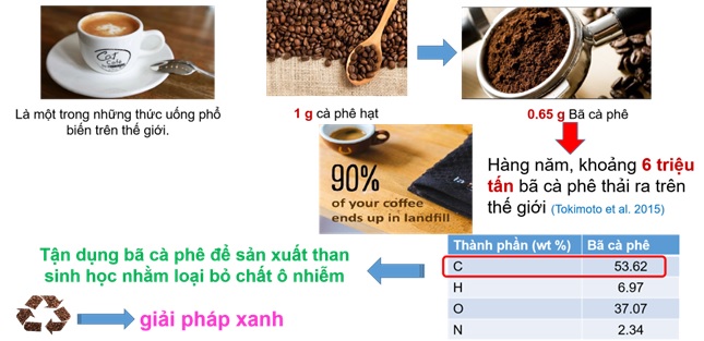 Việt Nam là quốc gia sản xuất cà phê lớn thứ hai thế giới. Để sản xuất ra 1 kg cà phê hòa tan chúng ta thải ra 2 kg bã cà phê. Để tận dụng sản phẩm thải bỏ này, từ năm 2019, nhóm nghiên cứu đã thực hiện nhiều nghiên cứu điều chế than sinh học (biochar) từ bã cà phê để hấp phụ Norfloxacin và Tetracycline trong nước. Kết quả cho thấy rằng khả năng hấp phụ tối đa của than sinh học từ bã cà phê đạt khoảng 70 mg/g đối với Norfloxacin và 39 mg/g đối với Tetracycline. Để tăng cường hiệu quả hấp phụ, than sinh học từ bã cà phê biến tính cũng được nghiên cứu. Kết quả khả năng hấp phụ tối đa đạt 134 – 370 mg/g đối với Tetracycline, cao gấp 2-9 lần so với than sinh học không biến tính. Ngoài ra, hydrocarbons đa vòng thơm (PAHs) trong than sinh học và dầu sinh học hình thành trong quá trình nhiệt phân cũng được xác định. Kết quả cho thấy tổng nồng độ PAH tăng từ 562 µg/kg lên 850 µg/kg khi nhiệt độ nhiệt phân tăng từ 300 °C đến 900 °C. Nồng độ PAHs thấp hơn so với các than sinh học điều chế từ gỗ đỏ, rơm rạ, ngô, gỗ mềm, gỗ tre, vỏ trấu, bùn giấy và thấp hơn ngưỡng an toàn cho than sinh học theo yêu cầu của Sáng kiến than sinh học quốc tế (IBI) và Chứng chỉ than sinh học của châu Âu. Những phát hiện này chứng minh rằng than sinh học từ bã cà phê được phát triển trong nghiên cứu này có thể được sử dụng như một chất hấp phụ hiệu quả về chi phí, thân thiện với môi trường và tiềm năng để loại bỏ các chất ô nhiễm hữu cơ mới như kháng sinh trong nước thải.