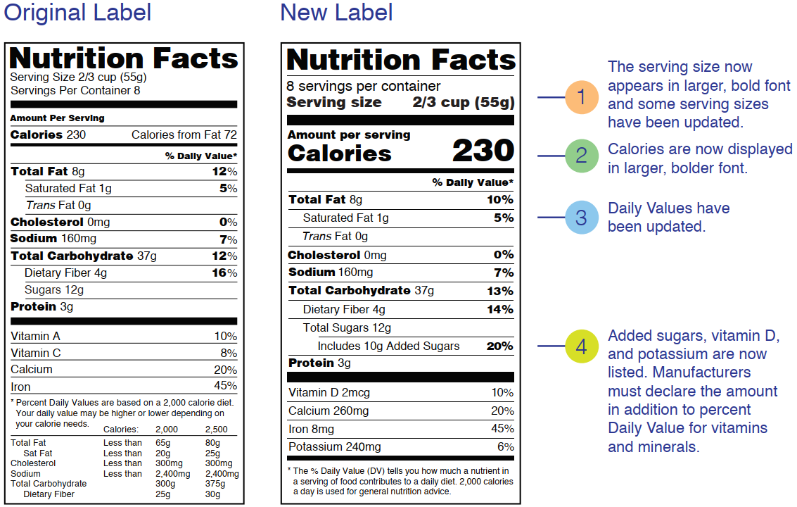 Vitamin D và Kali hiện bắt buộc phải được liệt kê trên nhãn. Chế độ ăn giàu vitamin D và Kali có thể làm giảm nguy cơ loãng xương và huyết áp cao.