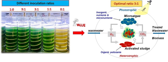 Vi tảo đã chứng minh tính khả thi của chúng trong việc xử lý nước thải nhờ chi phí thấp, vận hành dễ dàng và tiềm năng tăng doanh thu (ví dụ: sản xuất năng lượng sinh học và chiết xuất chất màu) (Rittmann, 2008; Mata et al., 2010). Công nghệ vi tảo là đáp ứng được yêu cầu phát triển công nghệ một giai đoạn nói trên. Vi tảo có thể hấp thụ lượng dinh dưỡng cao và sản xuất sinh khối trong thời gian ngắn (<24 giờ) (Godos et al., 2009; Zhang et al., 2011). Đồng thời, quá trình quang hợp của vi tảo giải phóng oxy tạo cơ hội tốt để cung cấp oxy cho quá trình bùn hoạt tính (Mata et al., 2010). Do đó, vi tảo có thể đóng vai trò như một “thiết bị sục khí” và thay thế cho hệ thống sục khí cơ học nhằm cắt giảm chi phí năng lượng cho việc sục khí (Jia & Yuan, 2018). Dựa trên khái niệm này, vi tảo và vi khuẩn có thể hỗ trợ lẫn nhau. Các nghiên cứu về sự cộng sinh của vi tảo-vi khuẩn đã được phát triển nhanh như một phương tiện để xử lý nước thải sinh hoạt và nước thải công nghiệp (Lee & Lei, 2019). Kết quả nghiên cứu của Nguyen et a., 2020 cho thấy với tỷ lệ vi tảo: bùn hoạt tính là 3:1 sẽ đồng thời loại bỏ chất hữu cơ/chất dinh dưỡng và sản xuất sinh khối đối với nước thải có tỷ lệ COD:N thấp. Điều kiện này giúp loại bỏ 86% TN, 79% TP và 99% COD và tổng nồng độ sinh khối là 1,12 g/L. Như vậy, vi tảo đã đóng một vai trò quan trọng trong quá trình đồng hóa chất dinh dưỡng trong khi bùn hoạt tính góp phần vào quá trình đồng hóa TN, khử nitơ và loại bỏ COD.