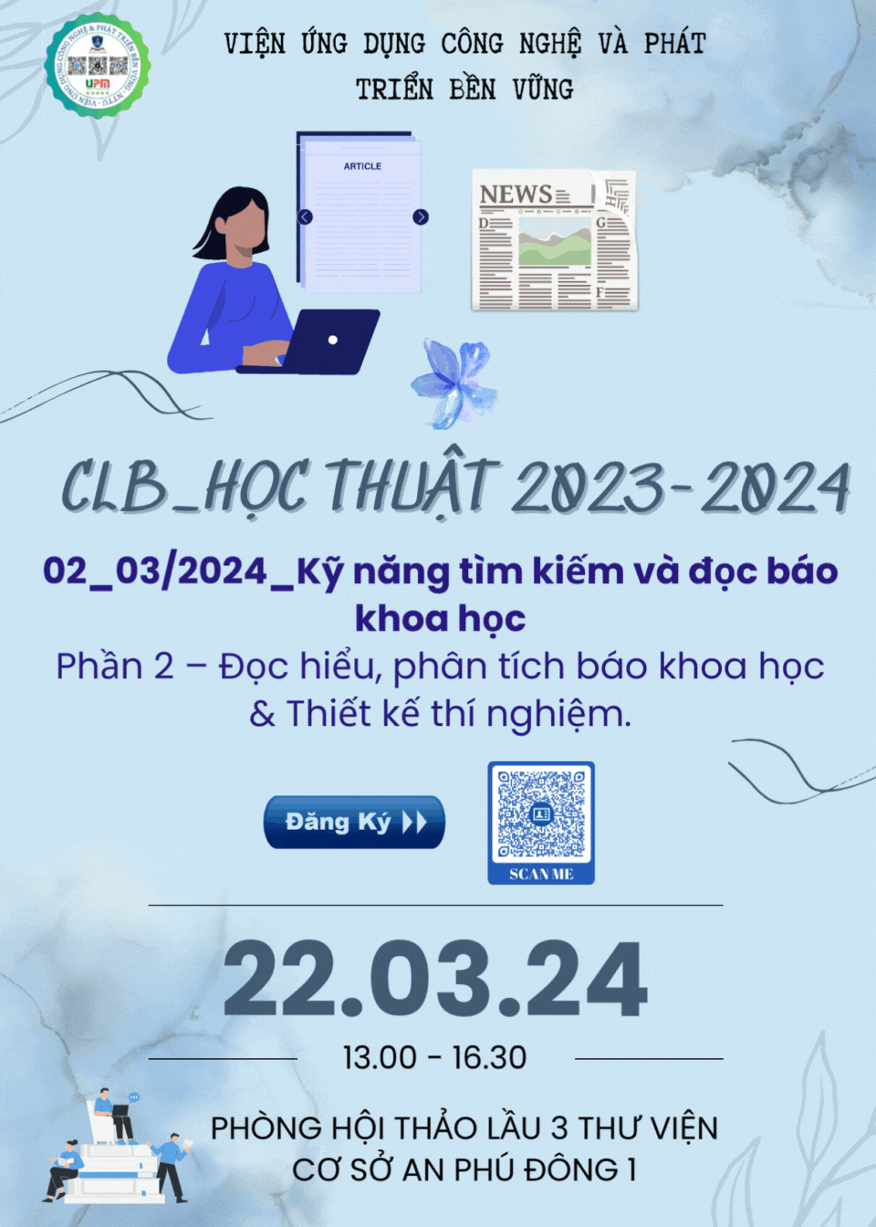Vào thứ sáu ngày 22/3/2024, Câu lạc bộ học thuật sinh viên đã được tổ chức định kỳ hằng tháng tiếp tục với chủ đề “Kỹ năng tìm kiếm và đọc bài báo khoa học” – phần 2: Đọc hiểu, phân tích bài báo khoa học và thiết kế thí nghiệm.