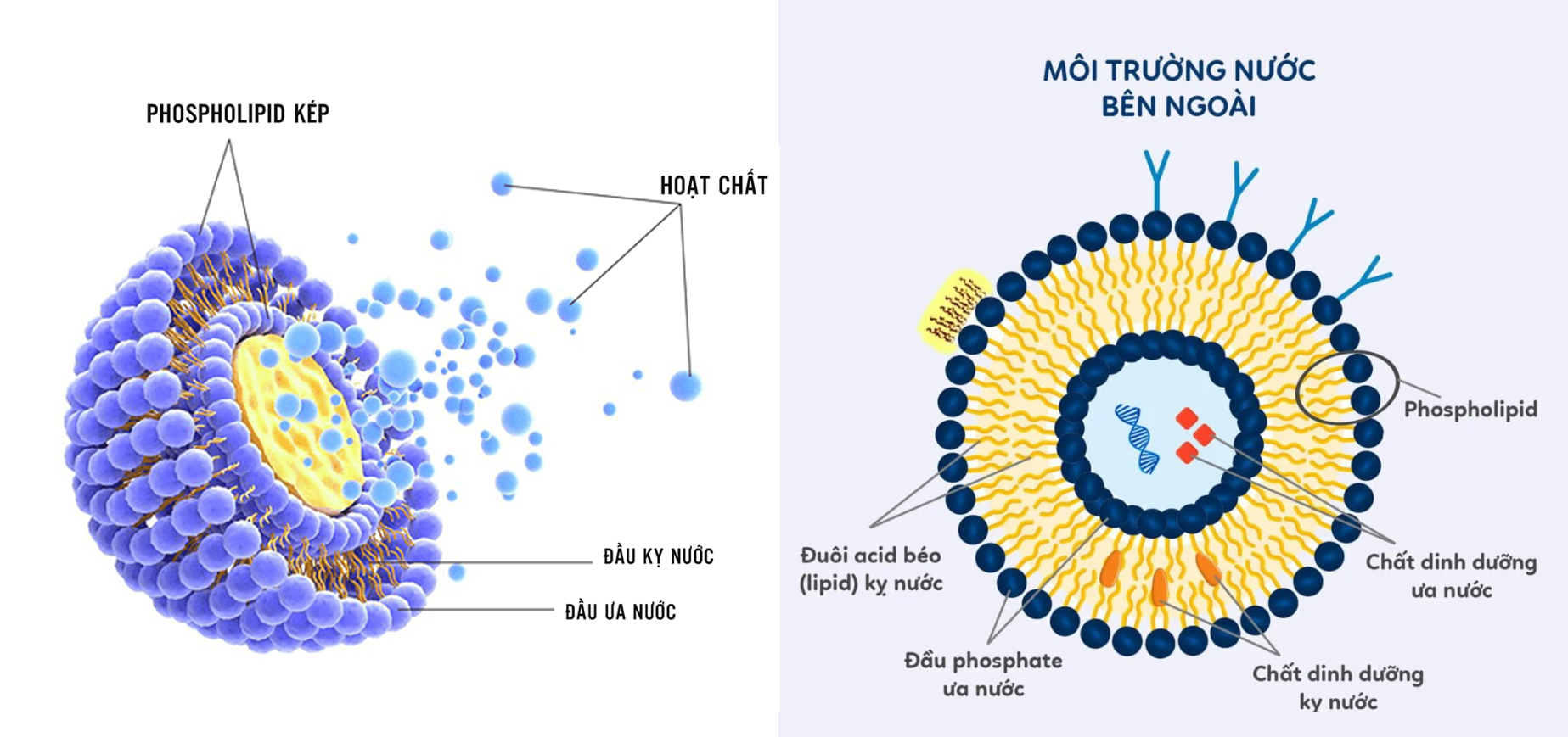 Liposome là các hạt nano có cấu trúc hình cầu, được tạo thành từ lớp kép phospholipid tương tự như màng tế bào. Do cấu trúc đặc biệt này, liposome có khả năng bao bọc và bảo vệ các thành phần hoạt chất, giúp cải thiện tính ổn định và sinh khả dụng của chúng.