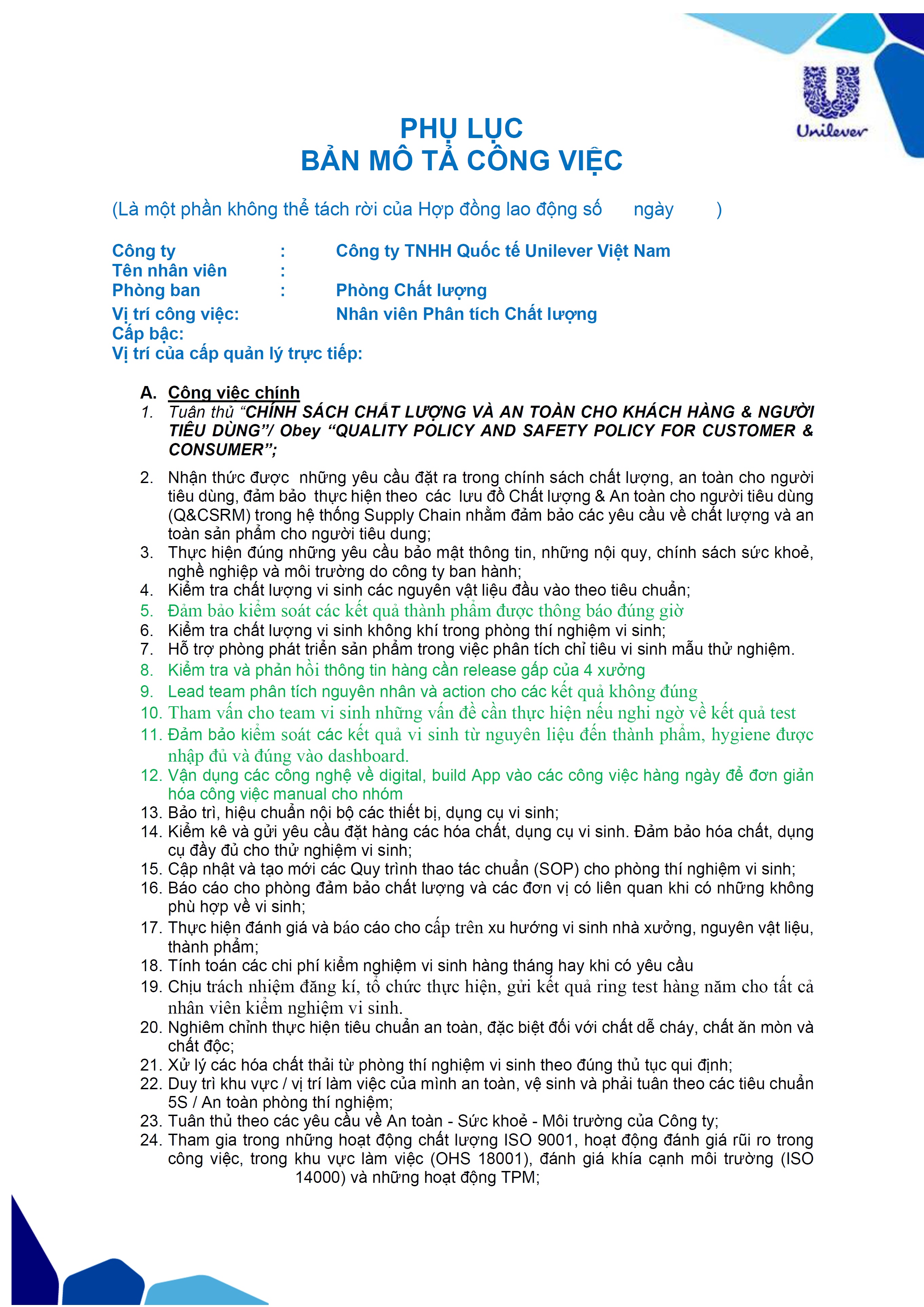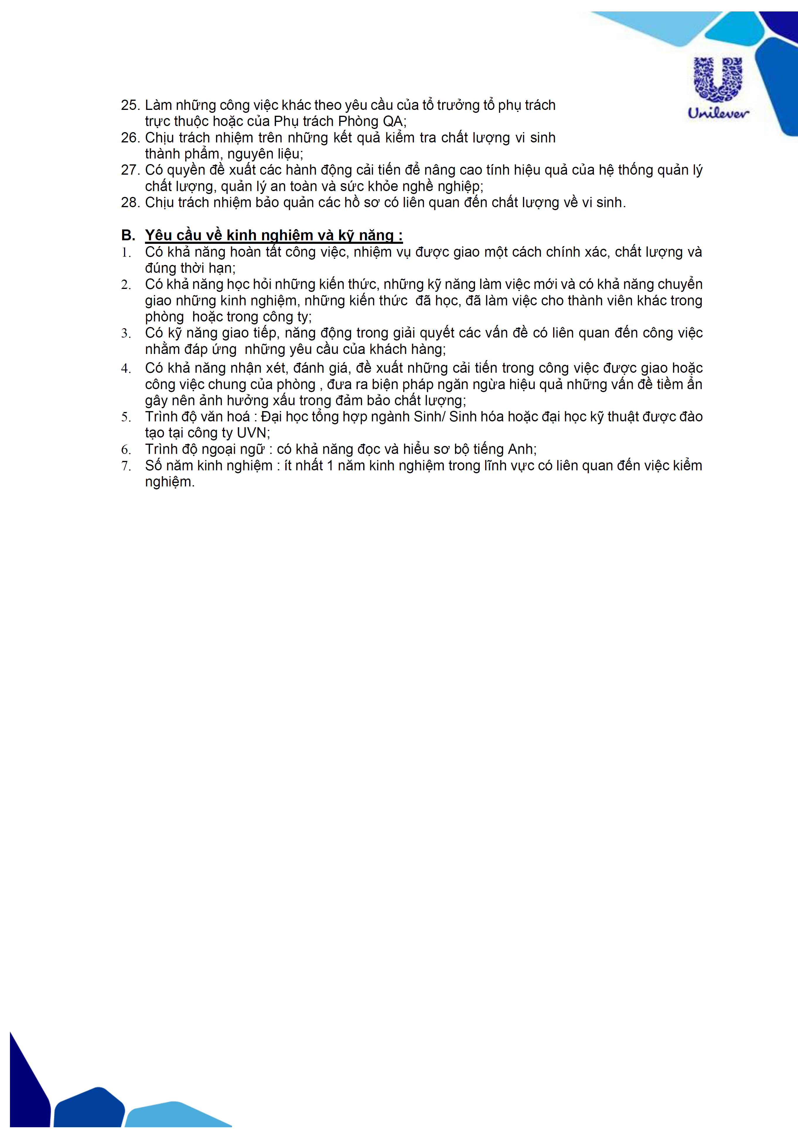 Tuyển dụng vị trí nhân viên phân tích chất lượng – Công ty TNHH Quốc tế Unilever Việt Nam Ứng viên có nhu cầu ứng tuyển, vui lòng gửi CV qua địa chỉ email: thai-ngoc.phung@unilever.com (Ms. Phụng – QA Department)